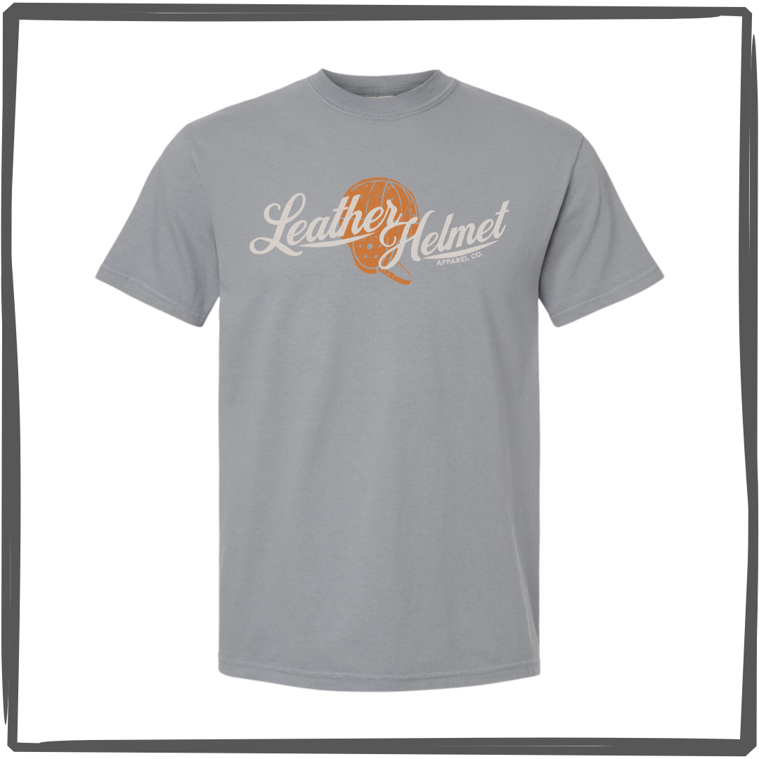 This gameday shirt from Leather Helmet Apparel Co. features a playful and vintage-inspired design. The back showcases a vintage baseball card illustration of a hound dog dressed in a classic baseball uniform, complete with a cap and bat, giving a nod to the old-school sports aesthetic. The design is framed in a retro trading card style with a bold “T” and the Leather Helmet brand logo.